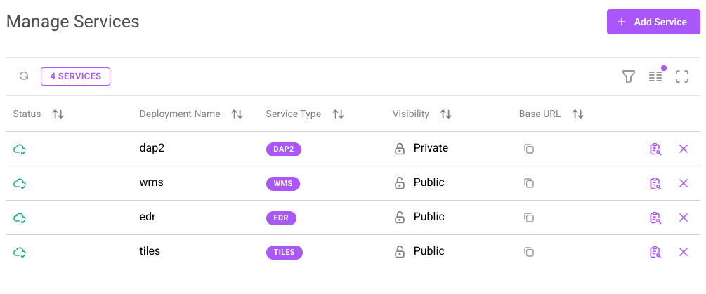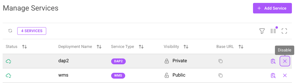 To manage what services are active, whether or not they are public, and to view logs navigate to https://app.earthmover.io/{org}/settings/services. No services are enabled automatically; they must be explicitly turned on before use.