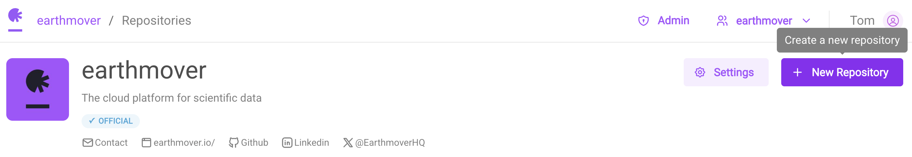 Navigate to your org's repositories page (for the org called earthmover this is https://app.earthmover.io/earthmover/repositories), then click New Repository.