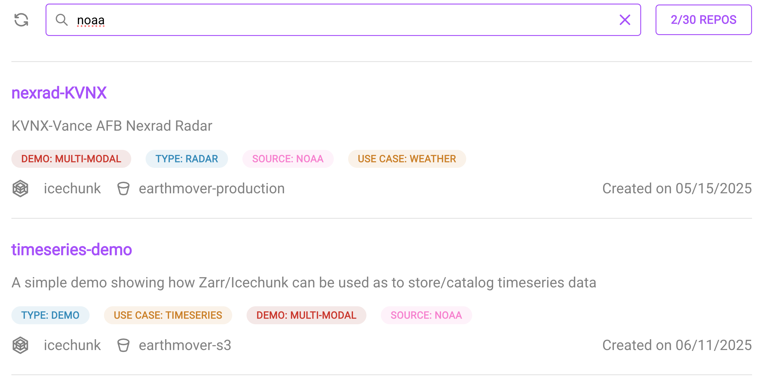 client.list_repos("earthmover", filter_metadata={"source": "NOAA"})