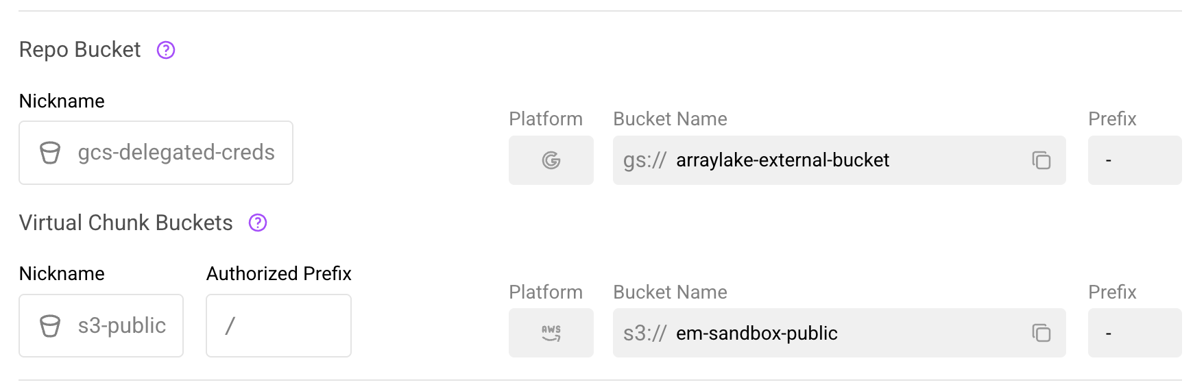 - Platform, Bucket Name, Prefix: Details of the underlying bucket configuration